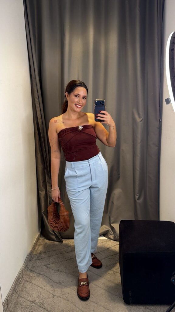 Blusa canelada um ombro 309,90 Calça 589,90 Bolsa 509,90