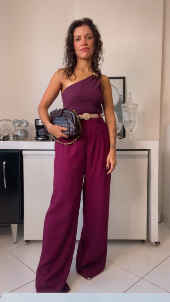 Blusa canelada um ombro 309,90 Calça pantalona 649,90 Bolsa 599,90