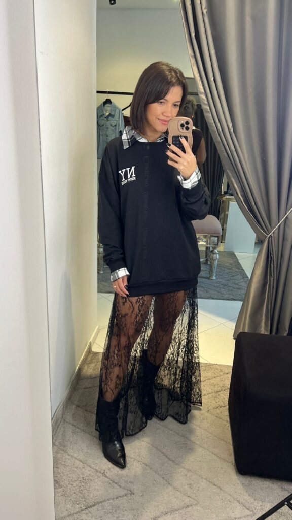Blusa moleton (faz parte do conj) 489,90 Camisa xadrez 389,90 Saia renda 489,90