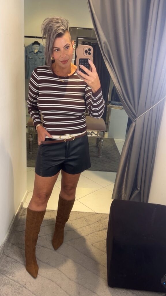 Blusa tricô 419,90. Cinto 99,90. Short PU 279,90