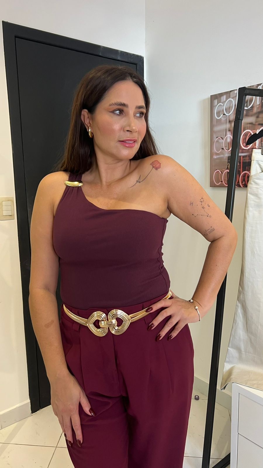 Blusa canelada um ombro 309,90 Calça pantalona 649,90
