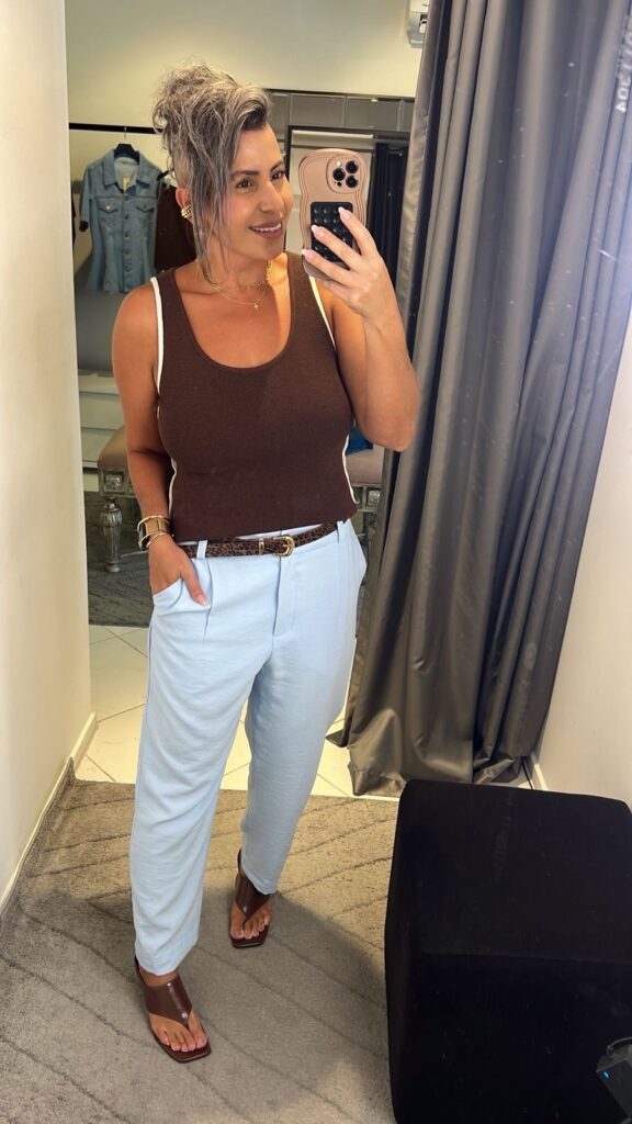 Regata modal 329,90 Calça alfaiataria 589,90. Cinto 109,90